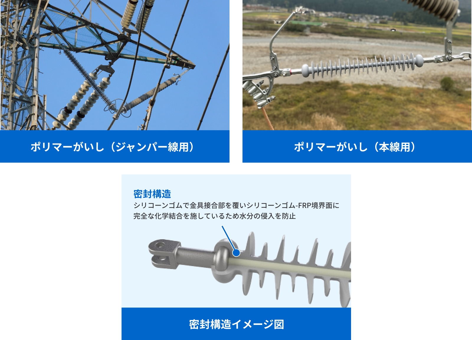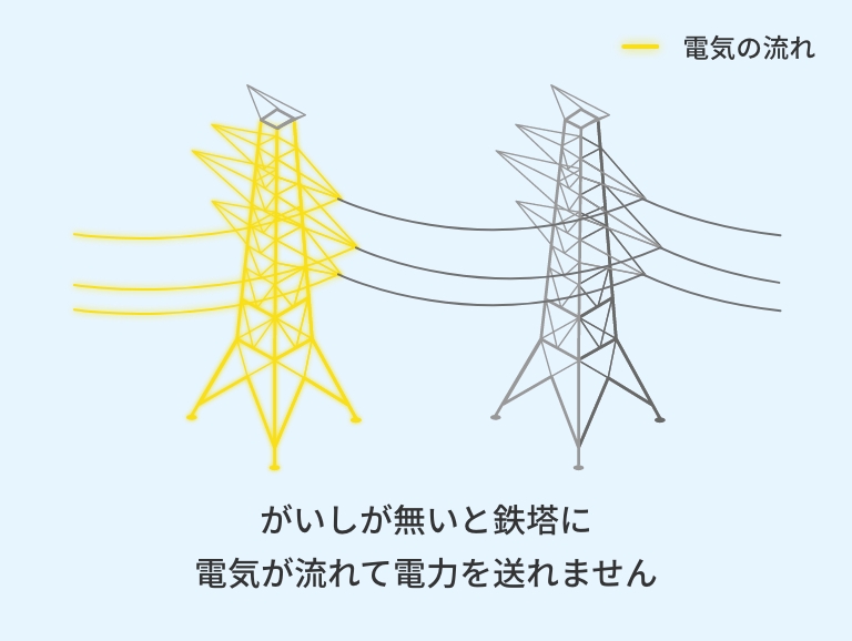 電力の安定供給には、送電線を支えつつ電気を絶縁する「がいし」が不可欠です。「がいし」が無いと、鉄塔に電気が流れて、電力を安定して送ることが出来ません。従来の磁器がいしは「重い・割れる」といった課題があり、特に東日本大震災では多くのがいしが破損しました。さらに、労働人口減少に伴い、輸送効率化や施工の省力化が求められています。こうした課題を解決するために、軽い、割れない、汚損特性に優れた「ポリマーがいし」が注目されており、当社は、長年のゴム研究成果と成形技術を組み合わせた大型ゴム成形技術を持って、電力輸送設備の合理化や維持管理コスト低減に貢献しています。