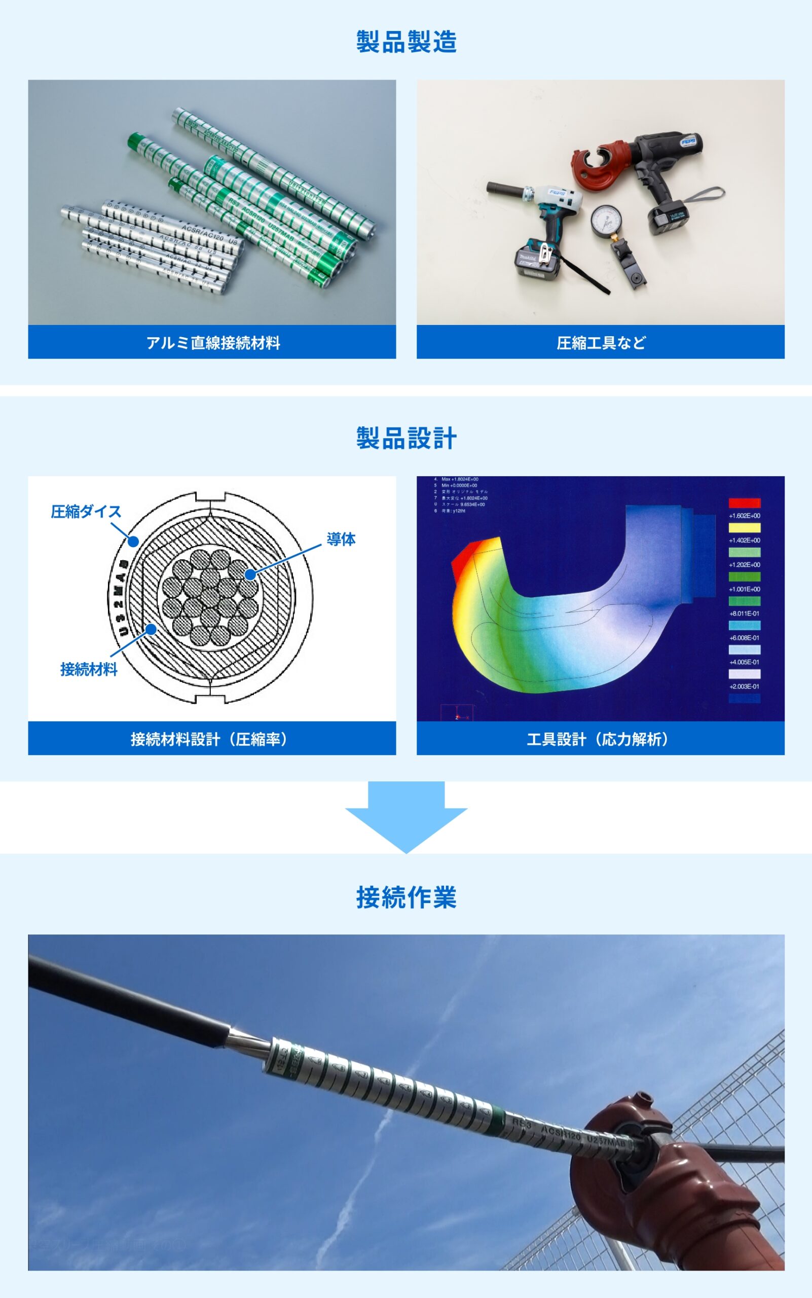 当社の技術は、特にアルミ電線接続の分野において、高品質で安定した接続性能を実現します。接続材料と圧縮工具の双方を自社で設計・製造しているため、接続部に求められる電気的性能および機械的性能を高い水準で両立し、長期にわたり安定した品質を維持することが可能です。また、独自開発の酸化防止コンパウンドを接続材にあらかじめ塗布することで、圧縮接続時に接続点がコンパウンドで覆われ、酸化被膜の発生を抑制します。これにより、接続の信頼性が一層向上します。圧縮工具についても、設計段階での応力解析と実機を用いた耐久性試験を組み合わせて実施し、長期使用に耐えうる信頼性を確保しています。