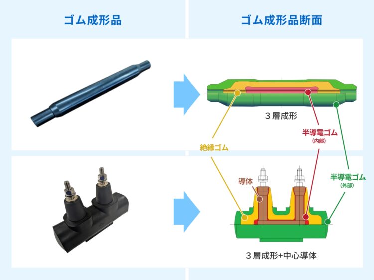 当社の技術は、精密に設計された金型を用いて、絶縁ゴムと半導電ゴムを自由に組み合わせて多層に積層することができ、ゴム同士を均一に密着・一体化させることができます。必要に応じて、通電用導体や金属金具(電極)をインサート(埋め込み)することも可能です。この技術により、電界制御が極めて重要な電力ケーブル接続部において、安定した電気性能を実現しています。