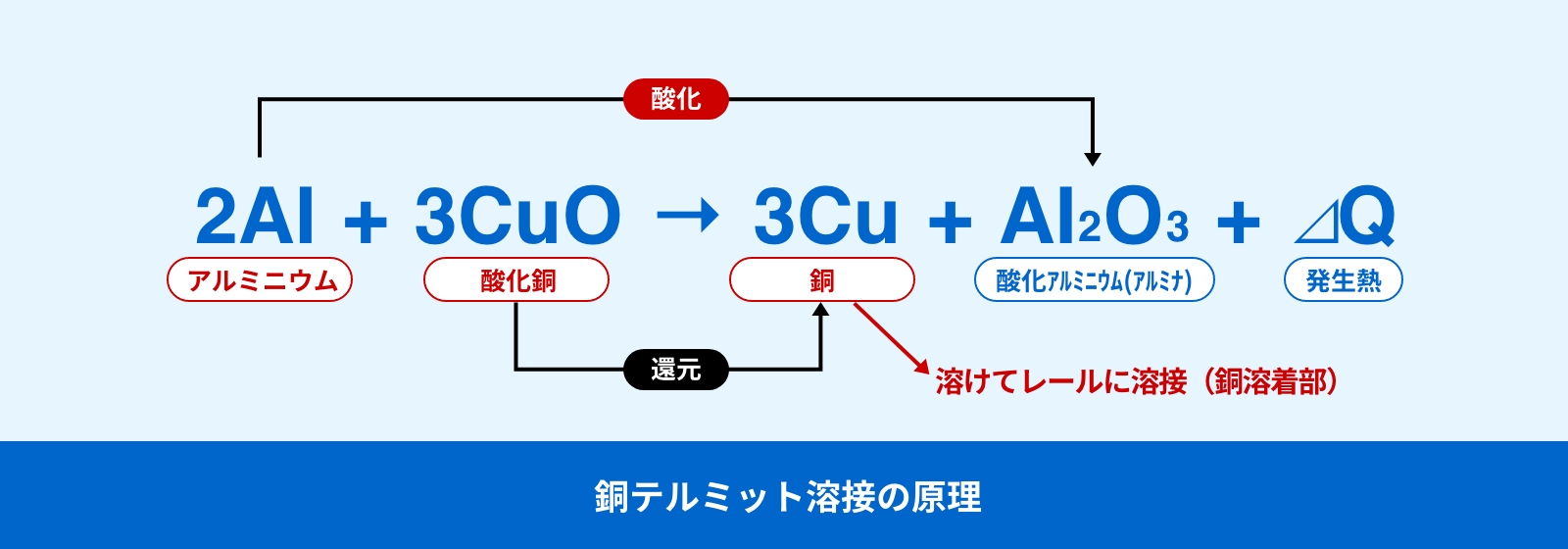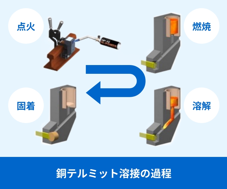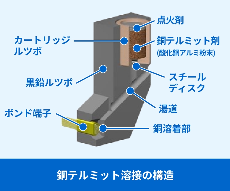 当社の技術は、酸化銅とアルミニウムの粉末を燃焼させる熱化学反応(テルミット反応)を応用した溶接接合です。このプロセスでは、反応によって発生する熱によって銅が溶融し、レールにボンド線を強固に接合します。溶接部は導電性と接合強度に優れ、腐食や経年劣化に強く、長期間にわたって安定した性能を維持します。また、テルミット剤と点火剤がカートリッジに充填されており、ワンタッチでルツボに挿入できるため、特別な技術を必要とせず安定した施工品質を実現します。