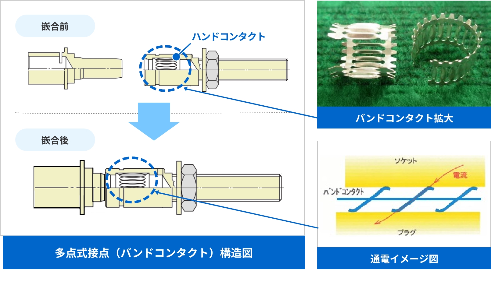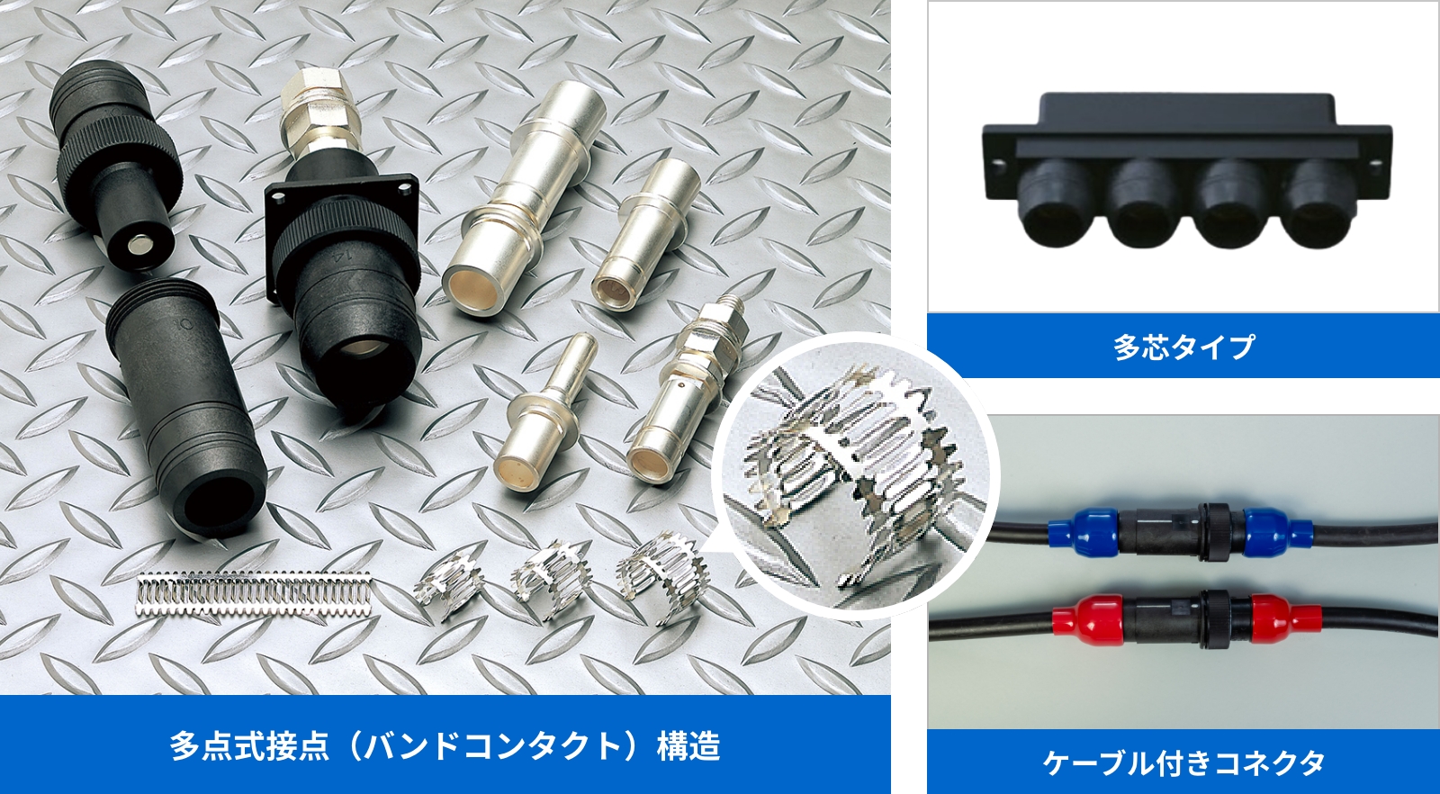 このバンドコンタクトを接点として用いたコネクタ製品を提供しています。誤接続を防ぐための構造を備えた製品もラインアップしており、安全性と確実な接続性を確保しています。標準品は単極コネクタですが、多芯タイプのコネクタや、コネクタと電線(ケーブル)を組み合わせたアッセンブリ品など、お客様の用途に応じたカスタマイズにも対応しています。
