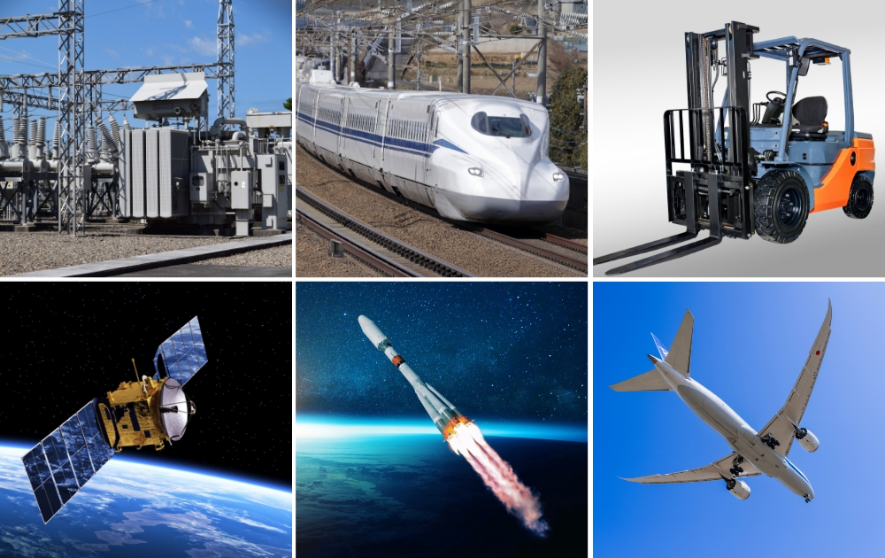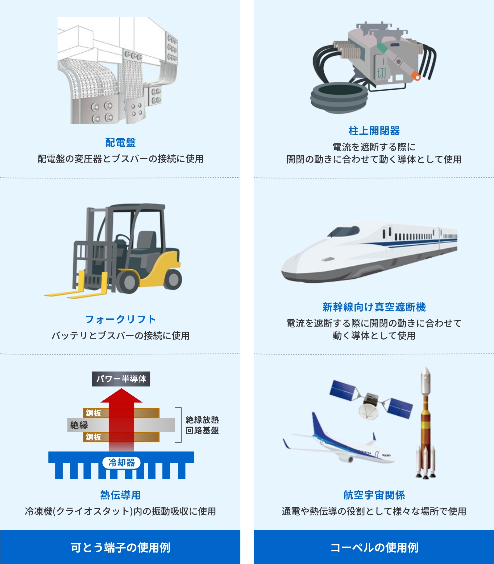 電気設備や輸送機器における接続箇所は、形状や用途がさまざまであるため、安定した接続と信頼性の確保が重要な課題となっています。こうした課題を解決するために、当社の可とう導体技術は、安定した通電性能や熱伝導を実現し、接続箇所の信頼性を向上させています。この技術は発電所から配電設備、ビルや工場、航空機や鉄道車両など、幅広い分野で使用され、電気だけでなく熱を伝導する機能も備えています。最近では、航空機や電気自動車など新しい分野への適用が増加しています。また、多様な接合方法を用いることで、お客様のニーズに合わせた製品形状にも柔軟に対応しています。