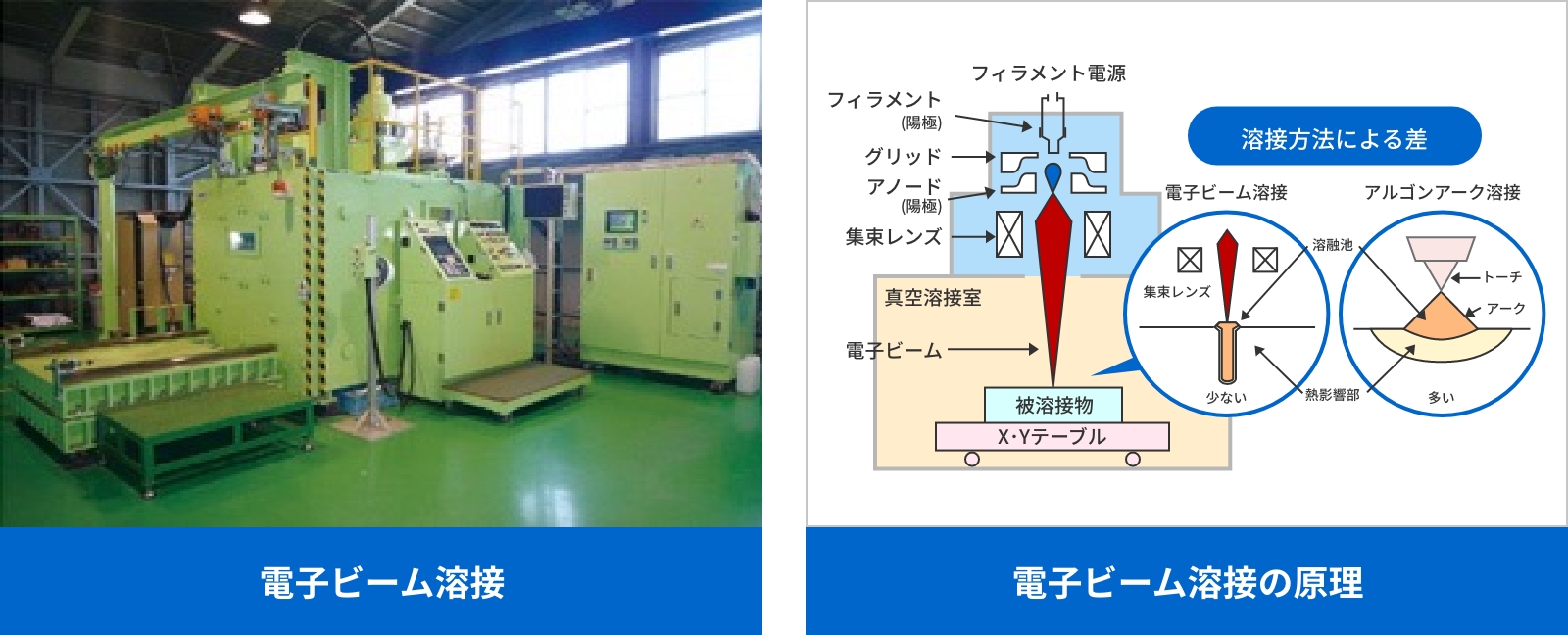 コーペルの溶接では10mm以上の深い溶け込みが必要となる場合が多く、大きな熱量を局部的に加えることのできる電子ビーム溶接が有効です。真空中で溶接するため酸化や変色が起こりにくく、品質を安定して確保できます。銅の溶接は熱量が大きく酸化や変色が課題となりますが、電子ビーム溶接の採用により、その課題を抑えた製品提供が可能になりました。当社ではこの技術を30年以上前に導入しており、現在も多くのお客様へ安定した品質で供給しています。