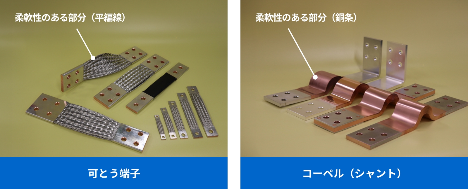 当社の技術は、機器間の多様な接続部において振動吸収や位置調整を容易にし、安定した通電性能と熱伝導性を実現します。平編組線の両端を大型プレスで端子成形した「可とう端子」は優れた柔軟性を備えます。薄い銅条を積層して両端に端子を接合した「コーペル(シャント)」は、高い導電性と優れた耐久性を兼ね備え、いずれの製品も幅広い用途で採用されています。当社のコーペルは銅材料を用いて製造しており、電子ビーム溶接、アルゴン溶接、リベット固定、はんだ付けなど、要求特性に合わせて多様な接合技術を使い分けています。特に大型製品では、溶接で作るものが一般的です。